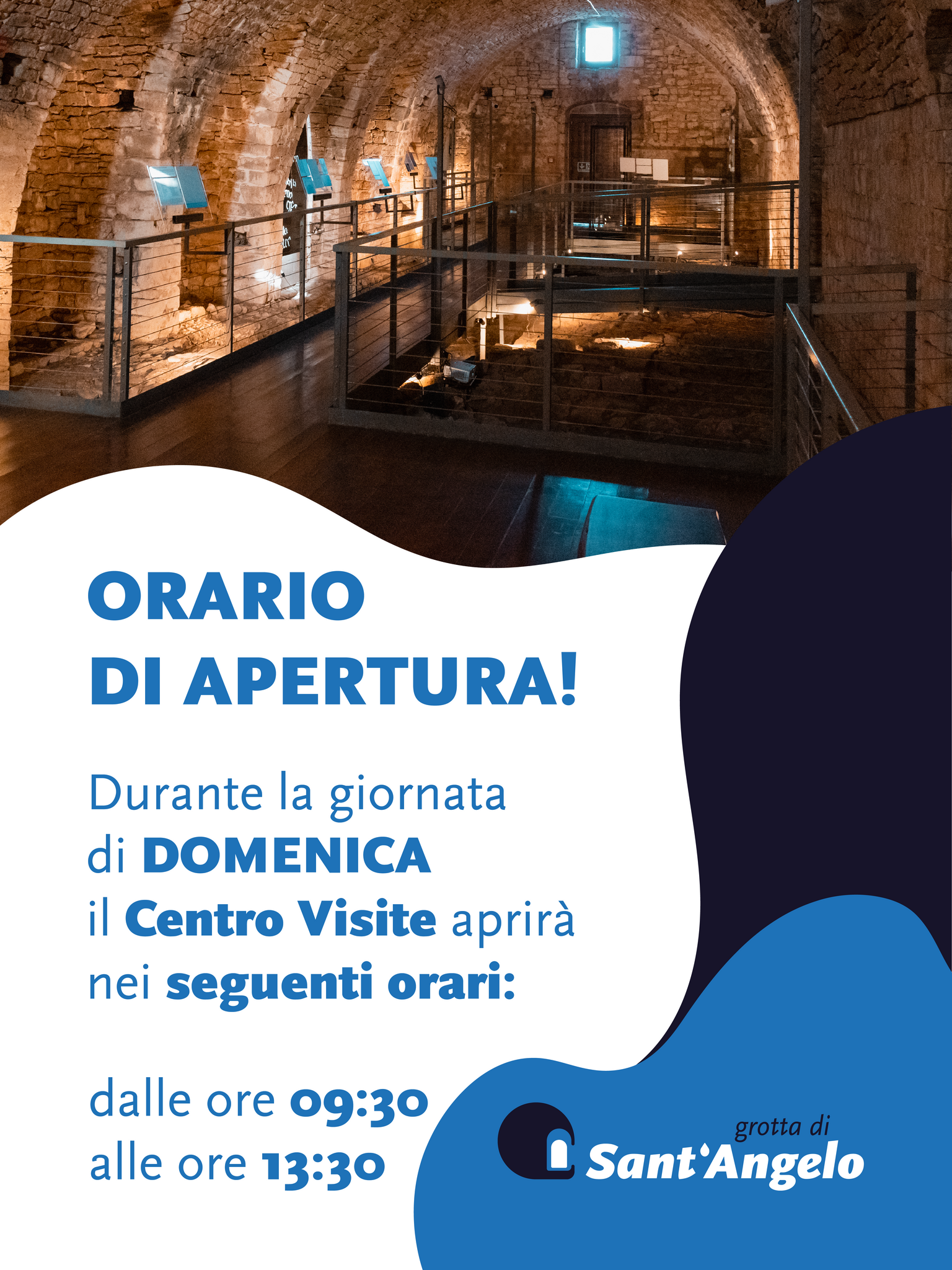 Domenica 9:30-13:30 Il Centro Visite della Grotta di Sant’Angelo è aperto ogni domenica. + Aggiungi a Google Calendar + iCal / Outlook export 00 giorni 00 ore 00 minuti 00 secondi Data 15 Febbraio 2026 Ora 9:30 - 13:30 Luogo Centro Visite della Grotta di Sant'Angelo Sito web http://www.grottadisantangelo.it Categoria Apertura regolare Organizzatore Archeoclub d'Italia APS "don Ignazio Fraccalvieri" Santeramo In Colle Email archeoclubsanteramo@hotmail.it Prossimo avvenimento Vai alla pagina necessaria Data 22 Feb 2026 Ora 9:30 - 13:30 Condividi questo evento